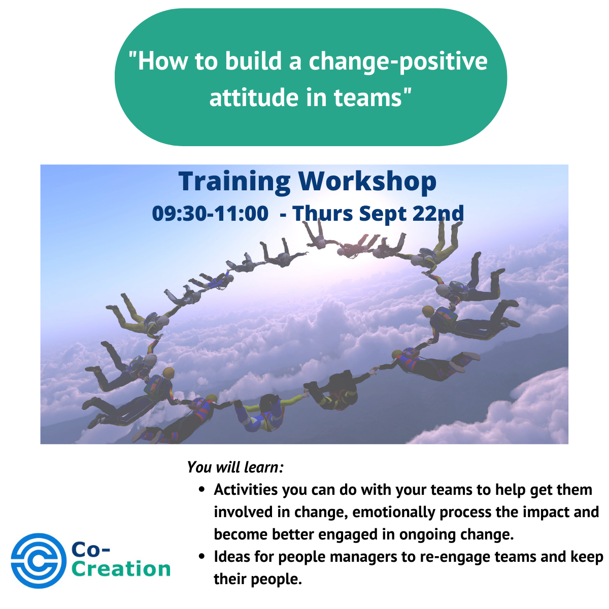 How to build a change-positive attitude in teams We are delighted to invite you to a new online training workshop on Thursday 22nd September at 9:30-11:00, delivered by Rebecca Stevens, Chartered Psychologist and Leadership Coach. At Co-Creation Group, we want to help you build an organisation which is adaptive and responsive to constant change. In […]